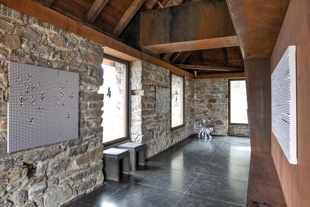 In der Ausstellung im Bergfried präsentiert Esther Stocker neben weiteren Arbeiten eine eigens für den Raum konzipierte lebensgroße Installation: „Atlas“. Atlas, der Titan in der griechischen Mythologie, der den Göttern des Olymps ihre Macht streitig machte und zur Strafe von Zeus dazu verurteilt wurde, auf ewig das Himmelsgewölbe auf seinen Schultern zu tragen. Auch der Bergfried-„Atlas“ ist mit einem Raster überzogen, der wie ein Korsett wirkt und an geografische Koordinaten erinnert. Der Camouflage-Effekt verwischt die Wahrnehmung von Fläche und Körper.